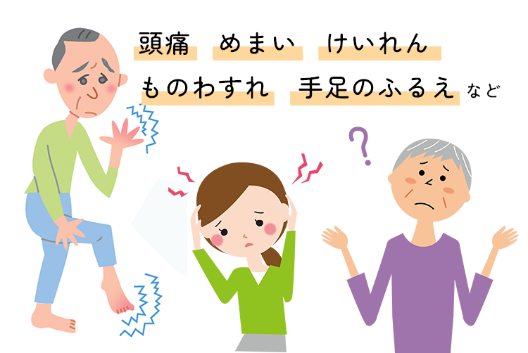頭痛、もの忘れ、めまい(ぐるぐる、ふわふわ)、ふらつき、しびれ、歩きにくい(ちょこちょこ歩く、小刻みに歩く、すり足、足が前に出にくい、すくむ、足を引きずるなど)、ふるえ(振戦)、足がむずむする、けいれん(ひきつけ)、てんかん、力が入りにくい(脱力・筋力低下)、手足が勝手に動く(不随意運動)、ろれつが回らない、言葉が出にくい、むせやすい、飲み込みにくい、物が二重に見える、まぶたが下がる(眼瞼下垂)、目が勝手に閉じる(眼瞼けいれん)、まぶたがぴくぴくする、顔の筋肉が引っ張られる(顔面けいれん)、顔の半分が動かない、顔が痛いなど